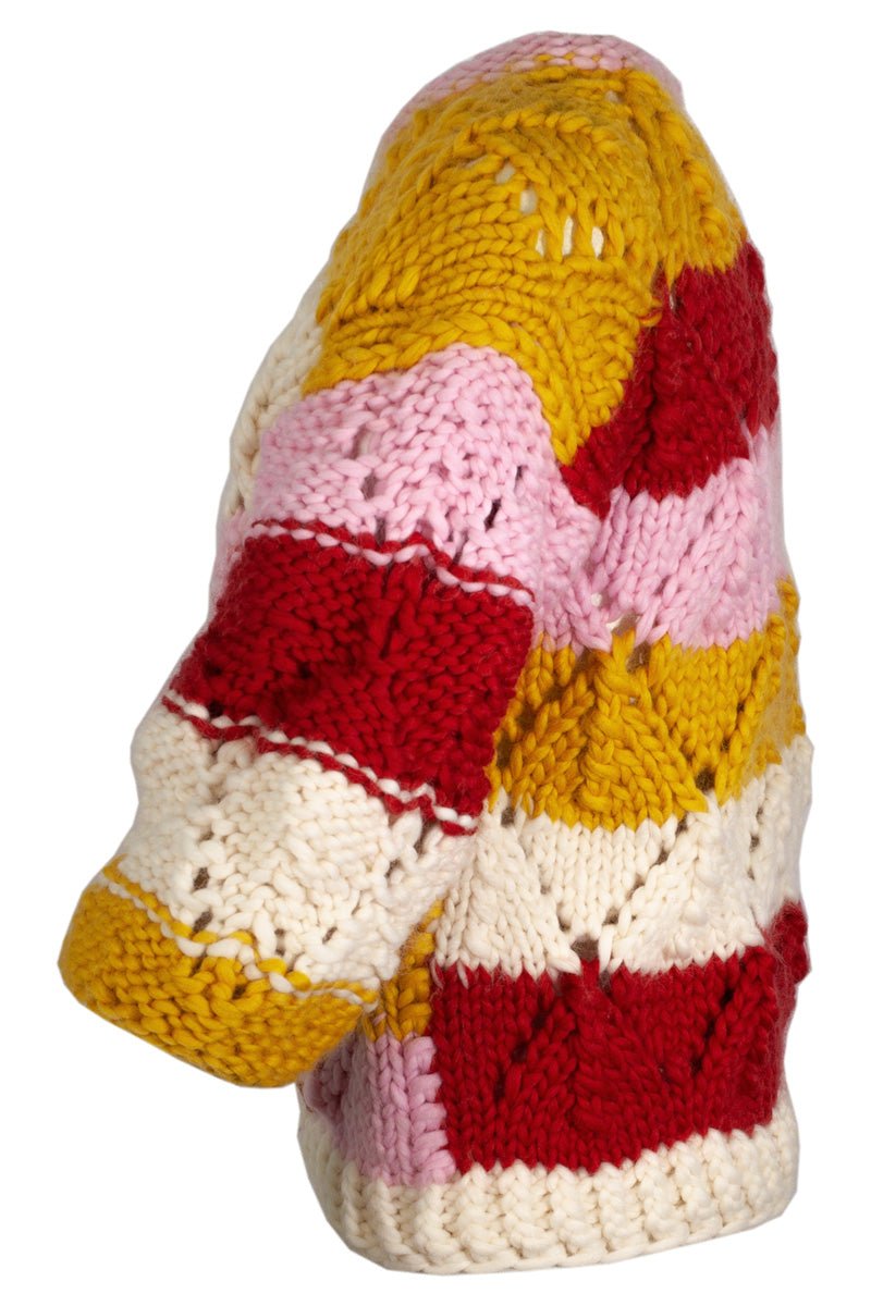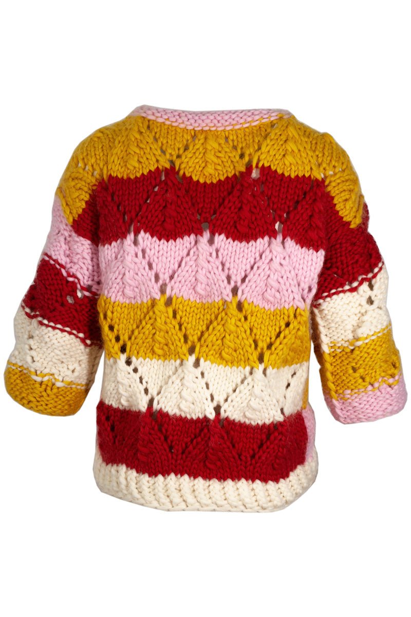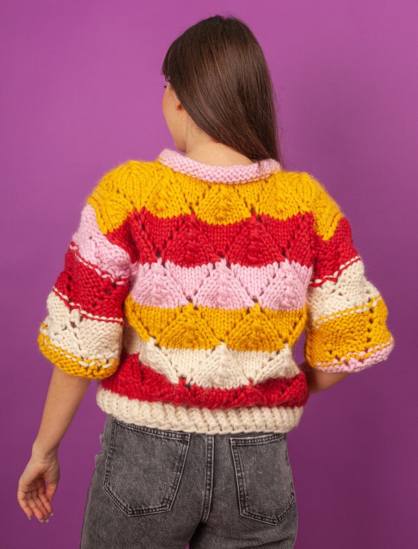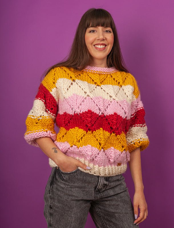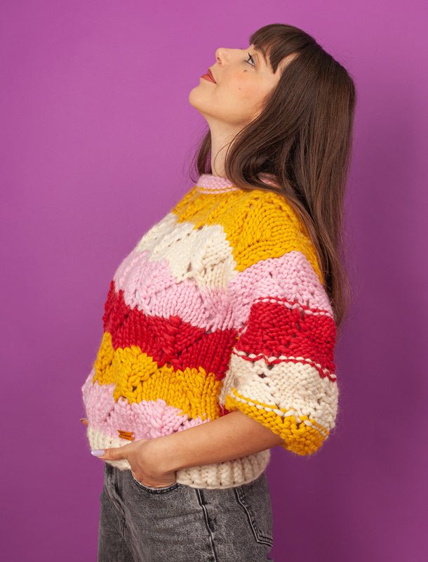 Fantezie is the antidote for boring. It's a smile handknitted in merino wool. A smile in the shape of a sweater with lacy leaves and mismatched stripes and a complete disregard for rules of any kind. There's freedom and inspiration in every stitch.
